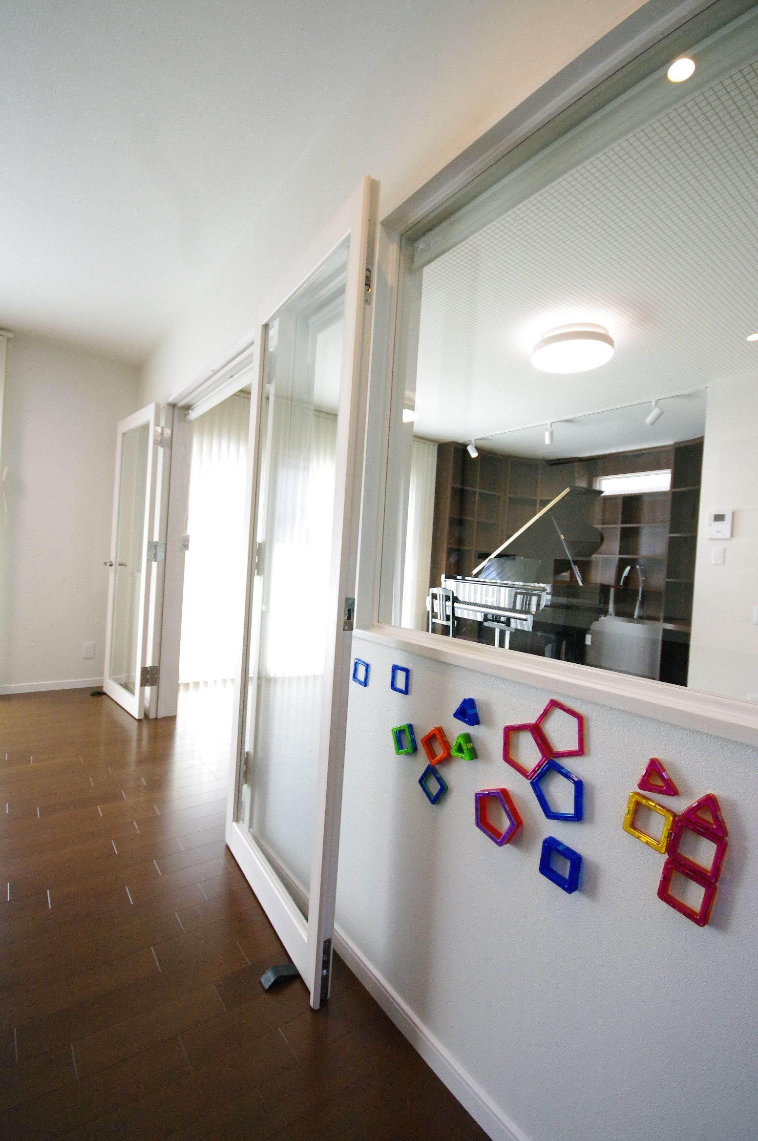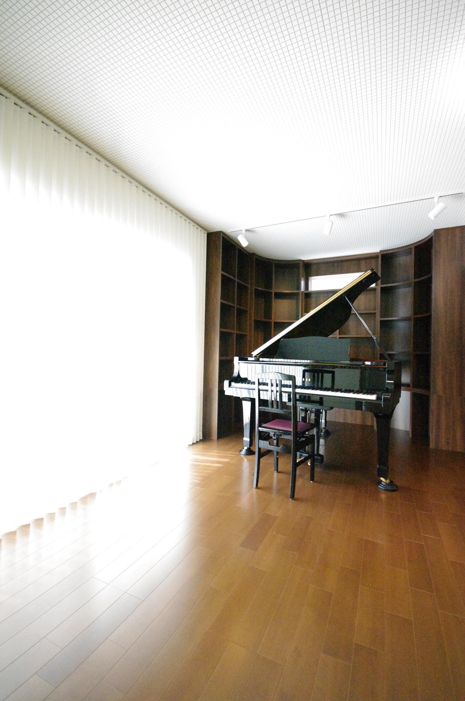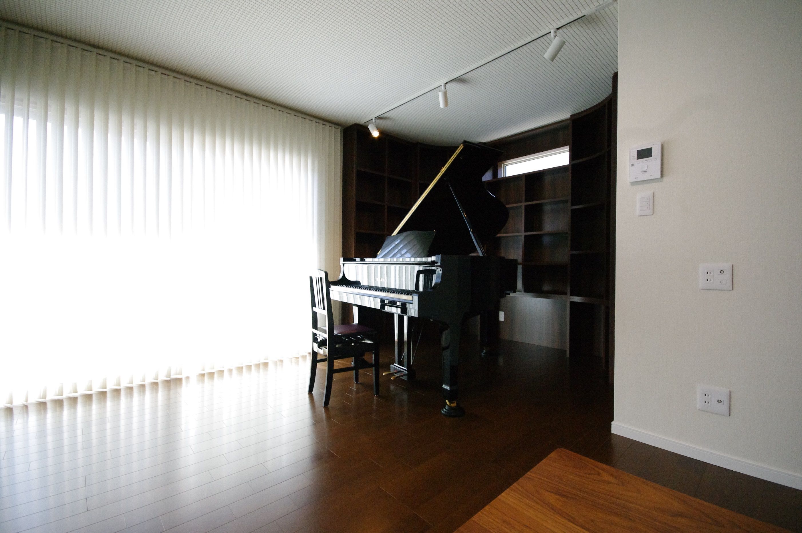 風が抜け太陽光が降り注ぐ明るいグランドピアノがあるリビング